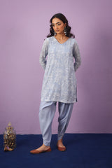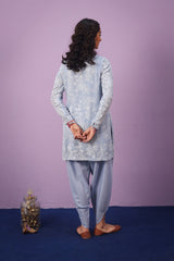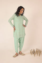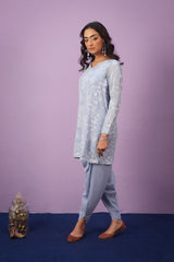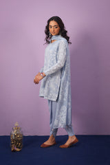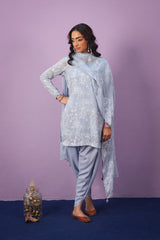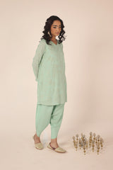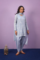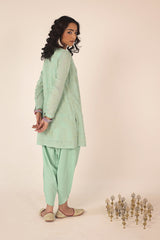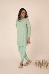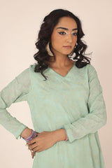 A tailored-fit Gulkaar kurta featuring a V-neckline, subtly enhanced with delicate lace detailing. The sleeve hems are adorned with fine lace trim, adding a touch of finesse. Paired with a solid-hued classic tulip shalwar for an effortlessly graceful look.