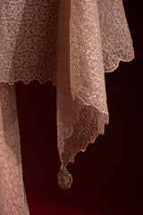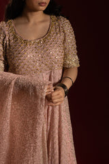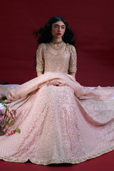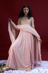 Embroidered Anarkali ensemble adorned with threadwork and fine sequin detailing. The bodice and puff sleeves are hand-embellished with gota, creating a rich couture texture. Soft gathers fall from the front and back empire line, forming a voluminous flare that moves with every step. The hemline is accented with hand-applied gota embellishment and the back features a delicate cut-out with a tie-up detail and handcrafted gota tassels. Lined with soft cotton silk. Paired with a tiered gharara, with soft gathers and finished with fine gota accents along the seams. Styled with a sheer organza dupatta, scattered with sequin, finished with scalloped edges and statement tassel detailing.