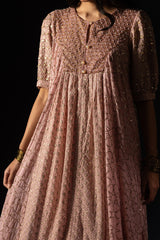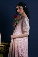 Embroidered Anarkali-style kameez adorned with threadwork and shimmering sequin detailing throughout. The bodice is richly embellished and highlighted with pearl and sequin accents. Soft gathers fall from the empire waist at the front and back, creating a flared silhouette that moves with every step. Feminine puff sleeves are finished with hand-applied gota work on cuffed hems. Comes with an inner for added comfort and structure. Paired with a tiered gharara featuring gota lace detailing for festive look.