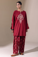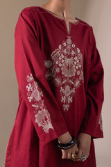 Embroidered classic-fit paneled shirt with a round neckline and V-slit, adorned with delicate stitching detail along the neckline and side slits. Paired with an embroidered classic-fit shalwar for an elegant, coordinated look.