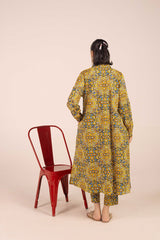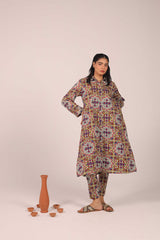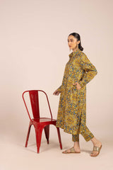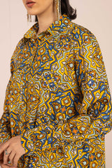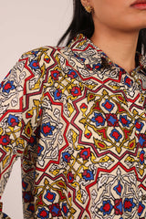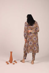 An easy-fit, vibrant printed kurta with a band collar neckline and front slit, adorned with button details. Side pockets add functionality and ease. Paired with matching printed straight-fit trousers for a coordinated, effortless look.