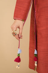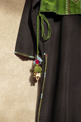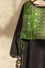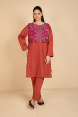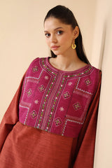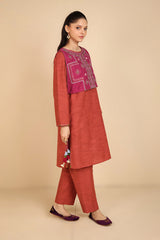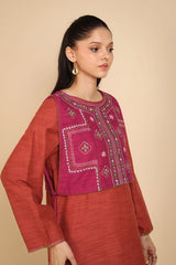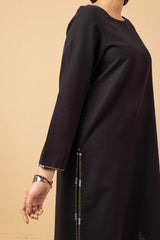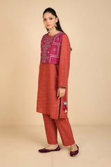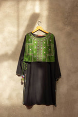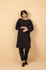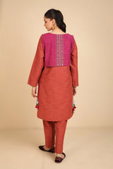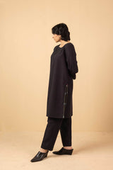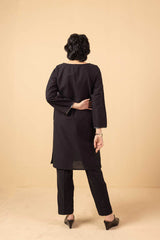 A loose fit shirt with round neckline, featuring embroidered detailing sleeve hems and chaaks. Paired with straight fit pants.