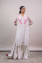 A hand-embroidered shirt with a V-neckline, adorned with tassel detailing. The intricate embroidery is further enhanced with delicate mirror work. Comes with an inner for added comfort and ease.