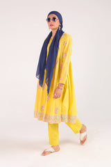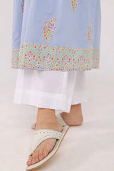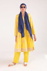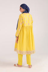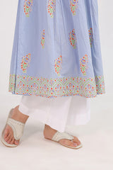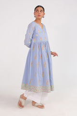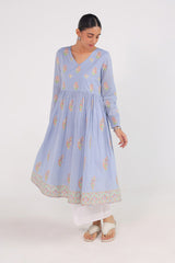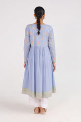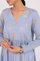 Hand block printed medium length anarkali with gather details on waist and back. The blockprints are accentuated with embroidery details.