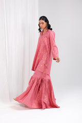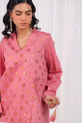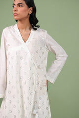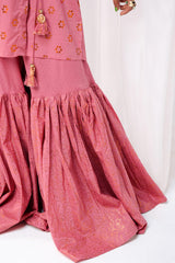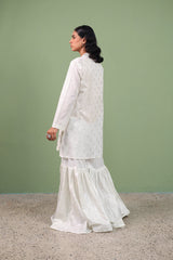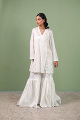 A foil-printed angrakha shirt adorned with playful tassels, paired with a matching printed gharara to bring effortless charm and festive flair to any celebration.