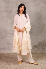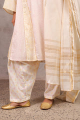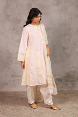 A hand block-printed paneled shirt with a round neckline and loop-button detailing, finished with gota lace on the sleeves and panels. Paired with a matching block-printed classic-fit shalwar adorned with gota lace, and styled with a dupatta featuring golden panni borders and gota accents.