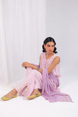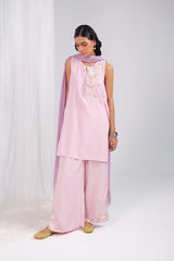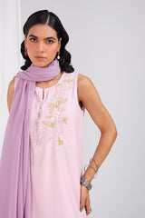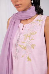 An embroidered shirt with a round neckline and V-slit, adorned with bead tassel detailing. Delicate embroidery and bead embellishments enhance the shirt, while matching culottes echo the design with embroidered and beaded accents. Styled with a contrasting dupatta finished with bead tassels for a refined, coordinated look.