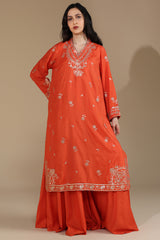 Embroidered classic-fit paneled shirt, adored with delicate sequins and embroidered detail. Paired with a generously flared sharara to create a refined statement silhouette.