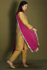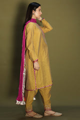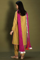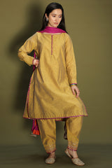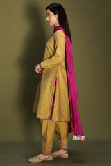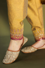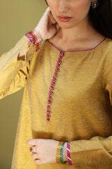 Rich classic-fit shirt with a subtle square neckline, adorned with loop buttons along the front slit. Finished with refined edges. Paired with a pegged shalwar featuring embroidered borders and delicate edging detailing. Comes with an inner for added comfort. Styled with a vibrant crushed dupatta with border detailing for a statement look.