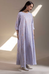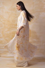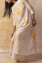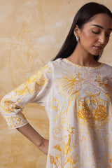 Aari embroidery graces this long A-line shirt, showcasing fine craftsmanship and timeless appeal. The round neckline is accented with subtle stitch detailing and cuffed sleeves, complemented by side pockets for ease. Finished with knot tassels and back pleats that add movement and subtle structure.