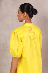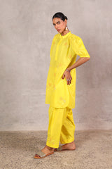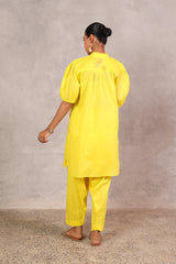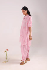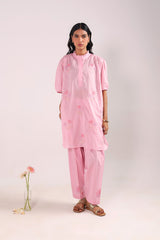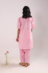A handcrafted applique shirt featuring soft frill accents along the neckline. It showcases floral applique work with hand embroidery, delicate floral motifs at the back and gentle gathers that create a flared silhouette. Cinched sleeves add charm, Paired with an embroidered classic-fit shalwar for an effortlessly graceful look.