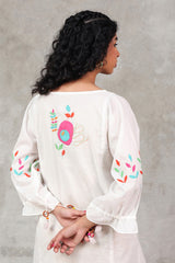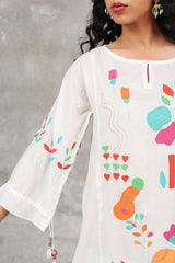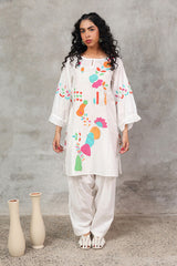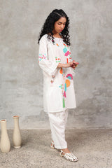 A handcrafted paneled kurta with a round neckline and V-slit, adorned with vibrant appliqué details enhanced by hand-stitching. Finished with fun tassel accents on the sleeves and paired with a classic-fit shalwar.