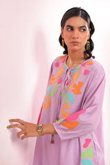 A handcrafted paneled kurta featuring a round neckline with a V-slit, adorned with playful tassel detailing. The bodice and sleeve hems feature hand embroidery and delicate applique work. Designed with drop shoulders and cuffed sleeves for a relaxed yet refined silhouette. It can be paired with any Generation bottoms for a classic look.