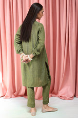 Hand-embroidered classic-fit shirt with a low band neckline and gilded button detailing along the placket, accented with subtle sequin work. Soft gathers on the shoulders and cuffed sleeves add structure. Paired with straight-fit trousers for an effortless look.