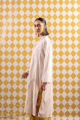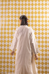 A paneled classic-fit hand crafted kurta with a band neckline and V-slit, detailed with buttons along the front placket. The subtle white-on-white floral applique adds elegance. Can be paired with any Generation lowers for a stylish and polished outfit.