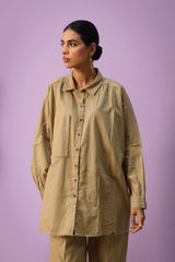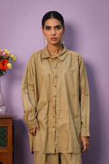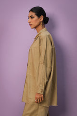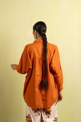 A solid-hued button-down top with a band collar neckline. The front slit is adorned with button details. Cuffed sleeves add a polished touch. Frill details on sleeves, front, and edges add feminine flair. The back features gathered frill details. Pairs effortlessly with any Generation fits for a chic look.