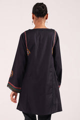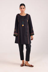 An embroidered paneled shirt with a round neckline, adorned with embroidered buttons and tassel detailing. Paired with straight-fit trousers for a coordinated, stylish look.