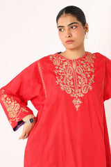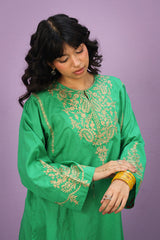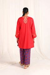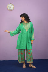 A paneled kurta with a speckled base features a round neckline with a V-slit. The front and back bodice are adorned with intricate golden taanka embroidery. The panels and sleeves are also detailed with delicate golden embroidery. It is paired with vibrant printed culottes, featuring intricate embroidery on the ankle hemline.