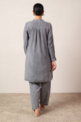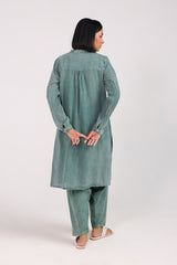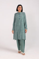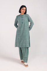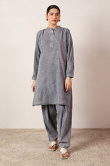 A textured shirt adorned with delicate heart-shaped embroidered motifs. Finished with frill detailing on the neckline and sleeve hems, and braid accents along the placket. Paired with a classic-fit shalwar for a chic look.