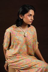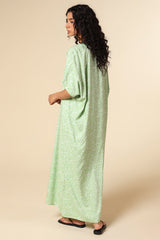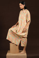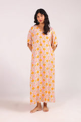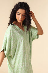 A floral printed kaftan dress, designed in a relaxed fit with a V-neckline and easy side slits. Its flowing silhouette and kimono-style loose sleeves bring effortless comfort with a touch of casual elegance.