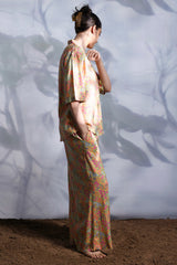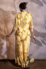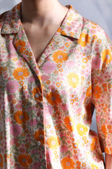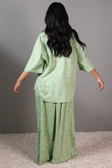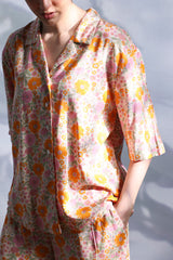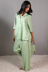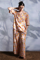 A relaxed-fit printed shirt with a collared neckline and buttons along the front placket, styled with half sleeves. Paired with matching printed trousers for an easy, coordinated look.