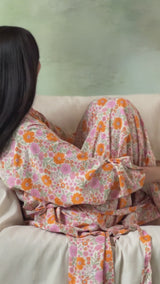 A lightweight printed front-open robe, designed in a relaxed fit with drop shoulders and a tie-up waist belt. Paired with a spaghetti-strap slip and matching comfortable trousers, this three-piece set brings comfort with a touch of chic style.