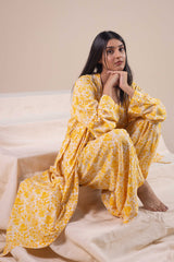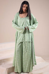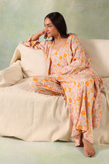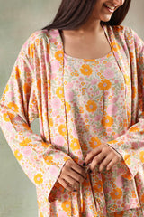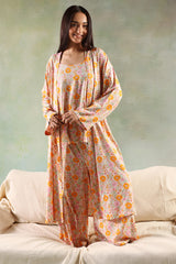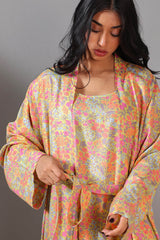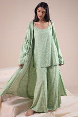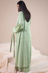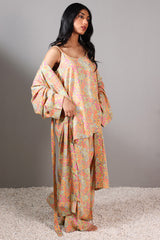 A lightweight printed front-open robe, designed in a relaxed fit with drop shoulders and a tie-up waist belt. Paired with a spaghetti-strap slip and matching comfortable trousers, this three-piece set brings comfort with a touch of chic style.