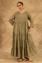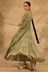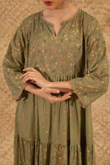 Floral printed long, flared tiered dress with a round neckline and V-slit, adorned with delicate crochet lace detailing along the neckline and sleeve hems. Soft gathers add a graceful, flowing movement to the silhouette.