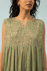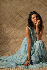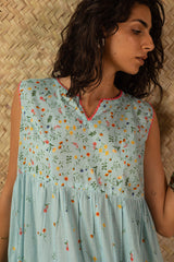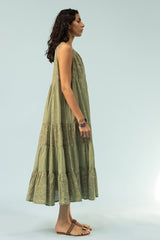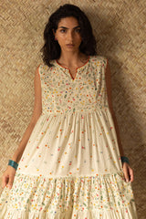 Lightweight, free-flowing printed tiered dress designed with a softly structured neckline, a sleeveless cut, and cascading gathered tiers that enhance volume and movement.