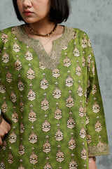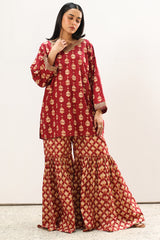 Classic-fit printed shirt with a round neckline and V-slit, finished with delicate embroidery along neckline and sleeve hems. Paired with a coordinated printed gharara.