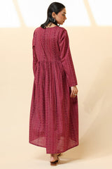 Chunari printed long flared dress designed with a V-neckline and button detailing along the front slit and sleeve hems. Gathers at the empire waist create a soft, flowing silhouette.