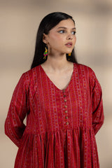 Chunari printed long flared dress designed with a V-neckline and button detailing along the front slit and sleeve hems. Gathers at the empire waist create a soft, flowing silhouette.