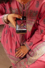 Classic-fit printed gathered shirt with a round neckline and buttons along the front slit. Gathers around the empire waist create a flowing silhouette. Paired with a coordinated printed farshi shalwar.