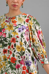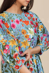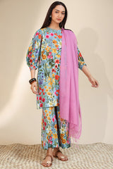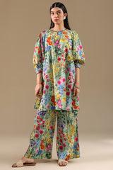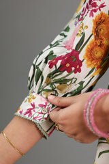 Soft floral printed classic-fit shirt with a keyhole neckline, finished with delicate lace detailing along the neckline and cuffed sleeve hems. Paired with matching printed culottes.