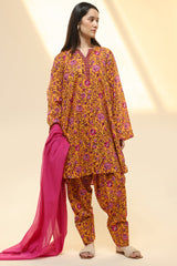 Printed classic-fit shirt with a round neckline and V-slit, finished with a softly rounded hem. Paired with a matching printed pegged shalwar, detailed with stitching along the borders.