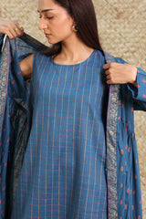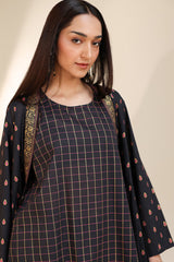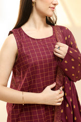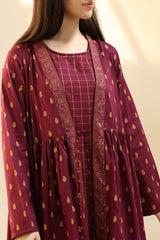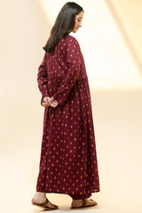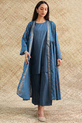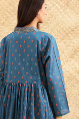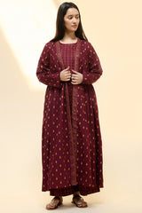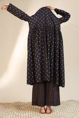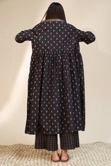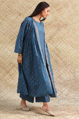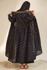 Long flared gold-printed Jama, designed with tassel detailing and soft gathers at the empire waist, layered over a classic-fit sleeveless shirt with a round neckline and matching printed culottes.