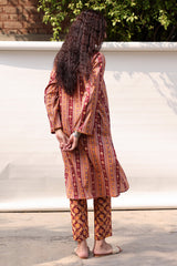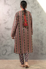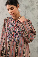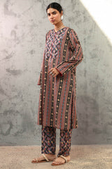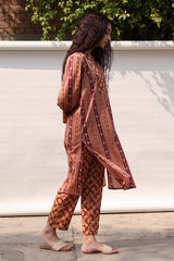 Classic-fit printed shirt designed with a round neckline and subtle V-slit, finished with delicate mukaish accents along the front slit. Paired with coordinated printed straight-fit trousers.