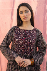 Long flared printed dress with a round neckline and loop button accents along the front slit. Subtle gathers at the bodice create an effortless, relaxed silhouette.