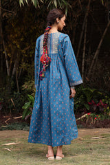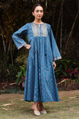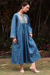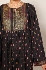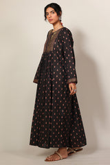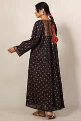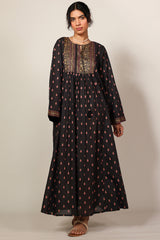 Gold-printed long flared dress featuring soft gathers at the empire waist that create soft movement and volume. Completed with a round neckline and subtle tassel accents detailing.
