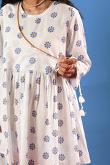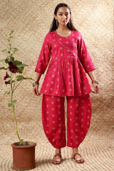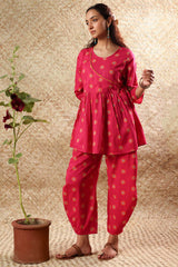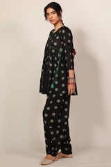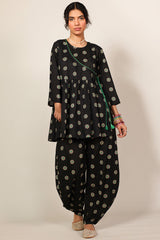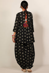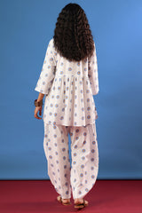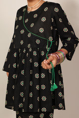 Printed angrakha-style shirt designed with a softly gathered empire waist and tassel detailing along the wrap tie. Paired with matching printed tulip shalwar.