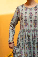 Floral printed long flared dress with a round neckline and V-slit, adorned with tassel detailing. Gathers at the empire waist create a soft, flowing silhouette.