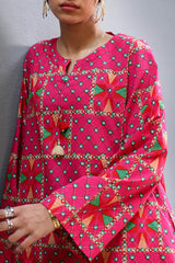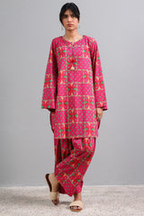 Classic-fit printed shirt with a round neckline and V-slit, adorned with tassel detailing and finished with a rounded hem. Paired with a matching printed farshi shalwar.