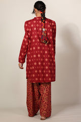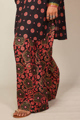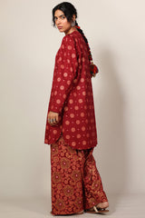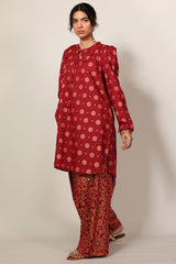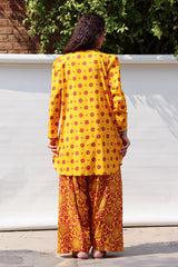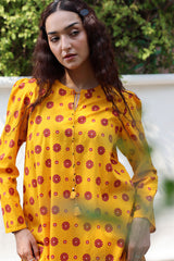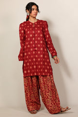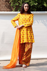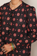 Relaxed-fit printed shirt with tassel detailing and soft puff sleeves, finished with a rounded hem. Paired with matching printed farshi shalwar.