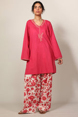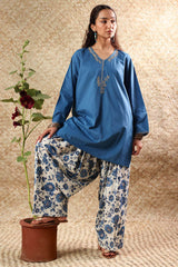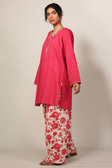 Classic-fit shirt with a V-neckline, adorned with delicate embroidered detailing along the neckline and sleeve hems. Paired with coordinated printed farshi shalwar for a timeless silhouette.