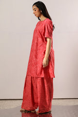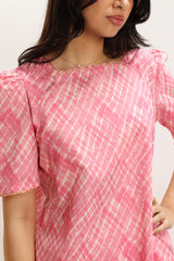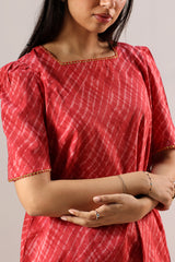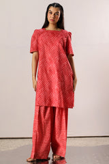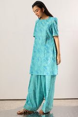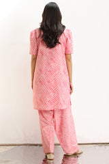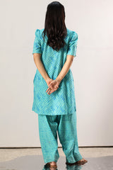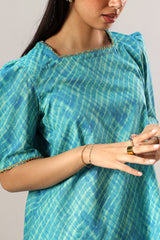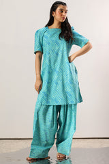 Classic-fit printed shirt with a square neckline, finished with delicate gota lace along the neckline and sleeve hems. Soft puffed sleeves. Paired with a coordinated printed farshi shalwar.