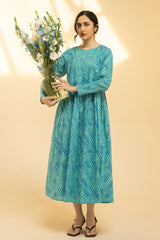 Chunari-printed Anarkali dress with a round neckline and button detailing along the front slit. Soft gathers at the empire waist create a fluid, flared silhouette.
