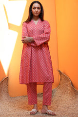 Paneled printed shirt designed with a V-neckline, subtly highlighted with fine stitching details along the neckline and sleeve hems. Paired with coordinated printed straight-fit trousers.