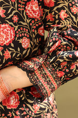 Classic-fit printed shirt with a keyhole neckline, adorned with scalloped lace detailing along the neckline and sleeve hems. Paired with matching printed farshi shalwar.