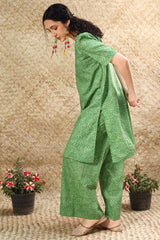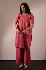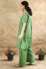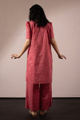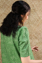 Classic-fit printed shirt with a V-neckline and soft puff sleeves, accented with bead embellishment along the neckline and sleeve hems. Paired with matching printed culottes.