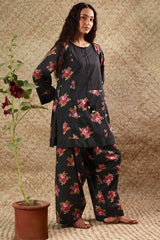 Paneled printed shirt designed with a round neckline and V-slit, enhanced with delicate tassel accents. Styled with matching printed farshi shalwar.